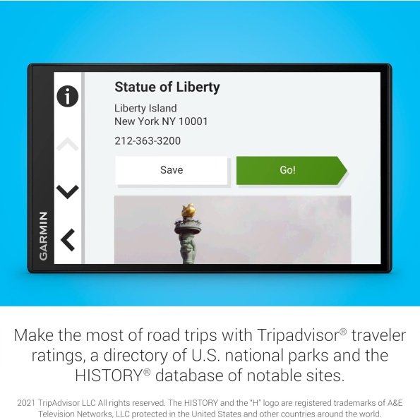 Road trip–ready features include the HISTORY database of notable sites, a U.S. national parks directory, Tripadvisor traveler ratings and millions of Foursquare POIs