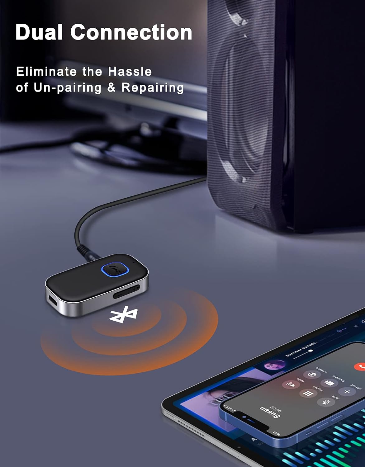 【Dual Connection】The portable Bluetooth stereo adapter can be paired with 2 devices at the same time. You can enjoy your music and never worry about missing any calls. Once paired, the car receiver will automatically reconnect to your last paired Bluetooth devices, as long as they are within the wireless range.