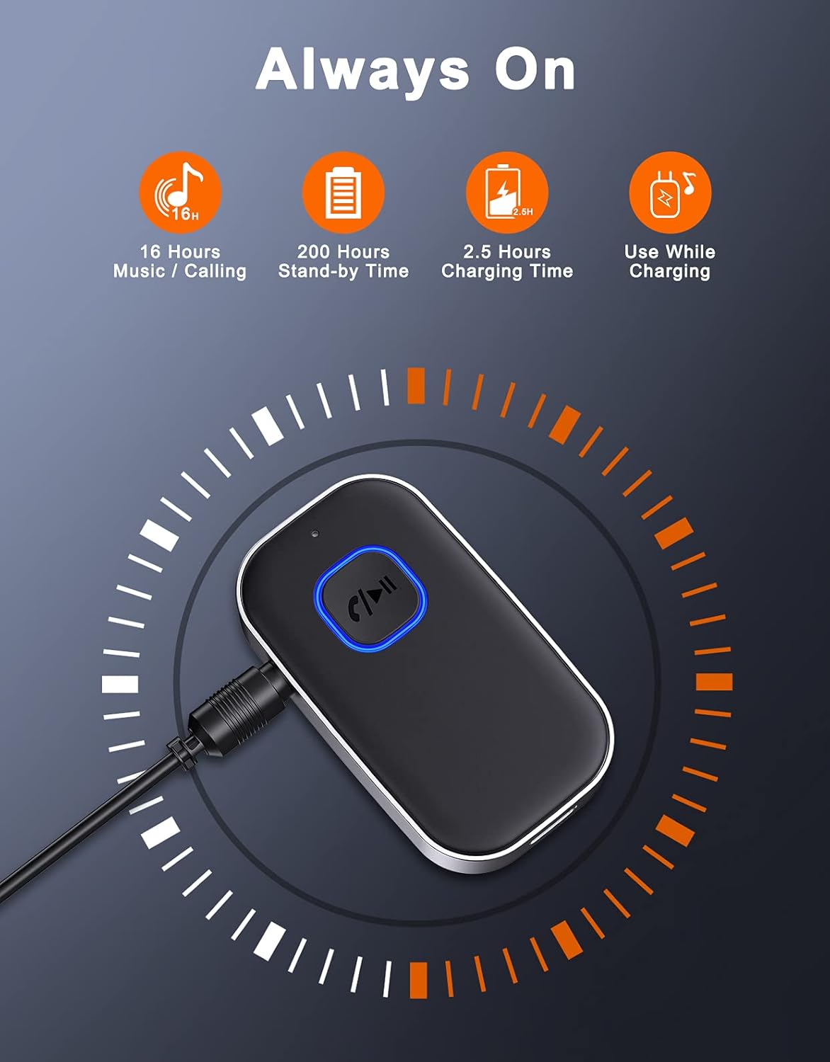 【Up to 16 Hours of Battery Life】The working time of this aux Bluetooth adapter is up to 16 hours when making calls or playing music. And it takes only 2.5 hours to fully charge the device by using a Type-C fast charging cable (Included in the package). In addition, this Bluetooth music adapter can be used while charging, which is very convenient.